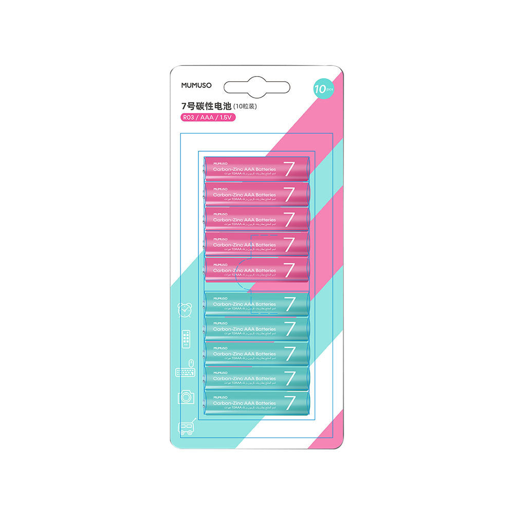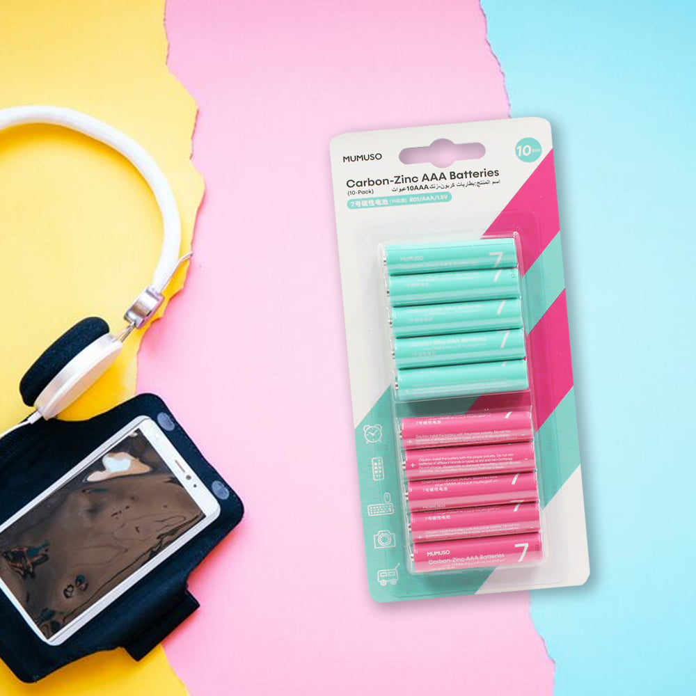 Our Mumuso Carbon-Zinc AAA Batteries are designed to deliver premium performance with a long service life. Each of the 10 batteries is equipped with advanced zinc-carbon chemistry, offering reliable, consistent power to your electronics. Get long-lasting power you can trust at an affordable price.