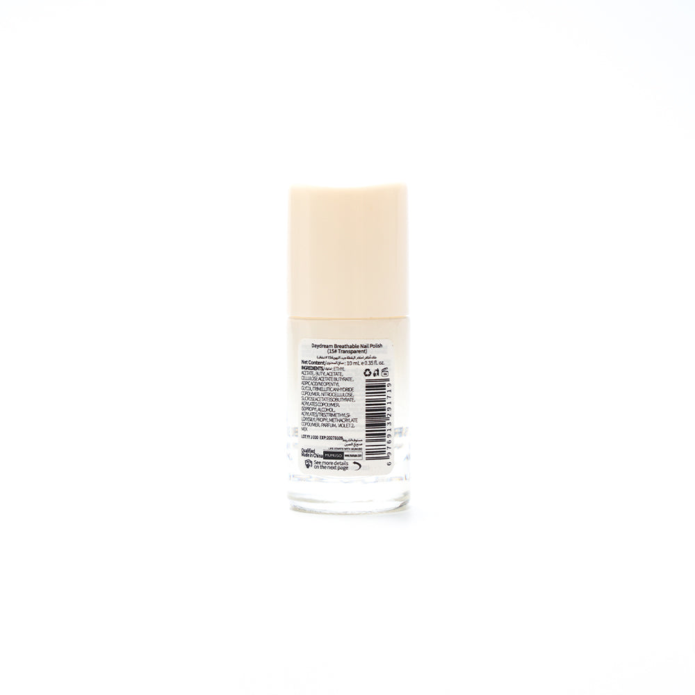Indulge in luxury with Mumuso's Daydream Breathable Nail Polish #15 Transparent. This premium polish offers a breathable formula for healthier nails, while providing a stunningly clear finish. Elevate your nail game with this exclusive product.