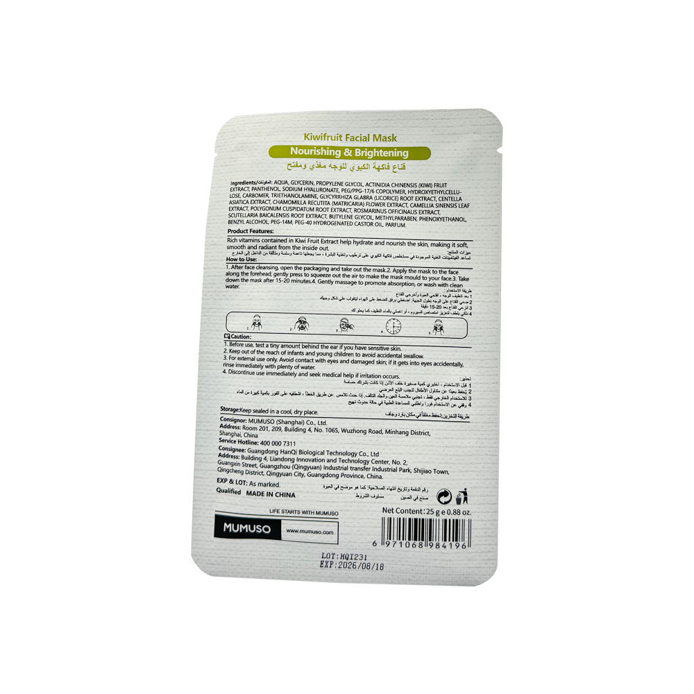"As an industry expert, we present the Mumuso Kiwi fruit Brightening Face Mask. This mask utilizes the benefits of natural kiwi fruit to brighten and rejuvenate the skin. With its high percentage of vitamin C, it helps to even out skin tone and improve complexion. Reveal a brighter, more radiant complexion with our Mumuso Kiwi fruit Brightening Face Mask."