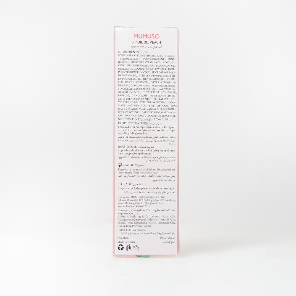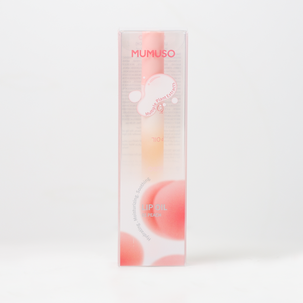 Indulge in pure luxury with Mumuso Lip Oil in "Peach". This premium lip oil not only adds a luscious shine to your lips, but also deeply nourishes and moisturizes them with its natural ingredients. Say goodbye to chapped lips and hello to a soft, supple pout. Elevate your lip care routine with Mumuso.