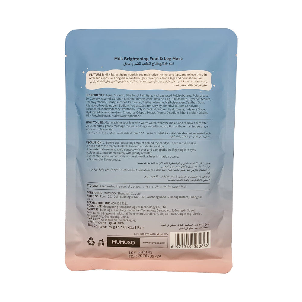 This Mumuso Milk Brightening Foot & Leg Mask sachet is a luxurious way to deeply moisturize and nourish the skin of your feet and lower legs. This special mask contains natural, plant-based ingredients to help even your skins tone, improve hydration, and reduce the appearance of blemishes.