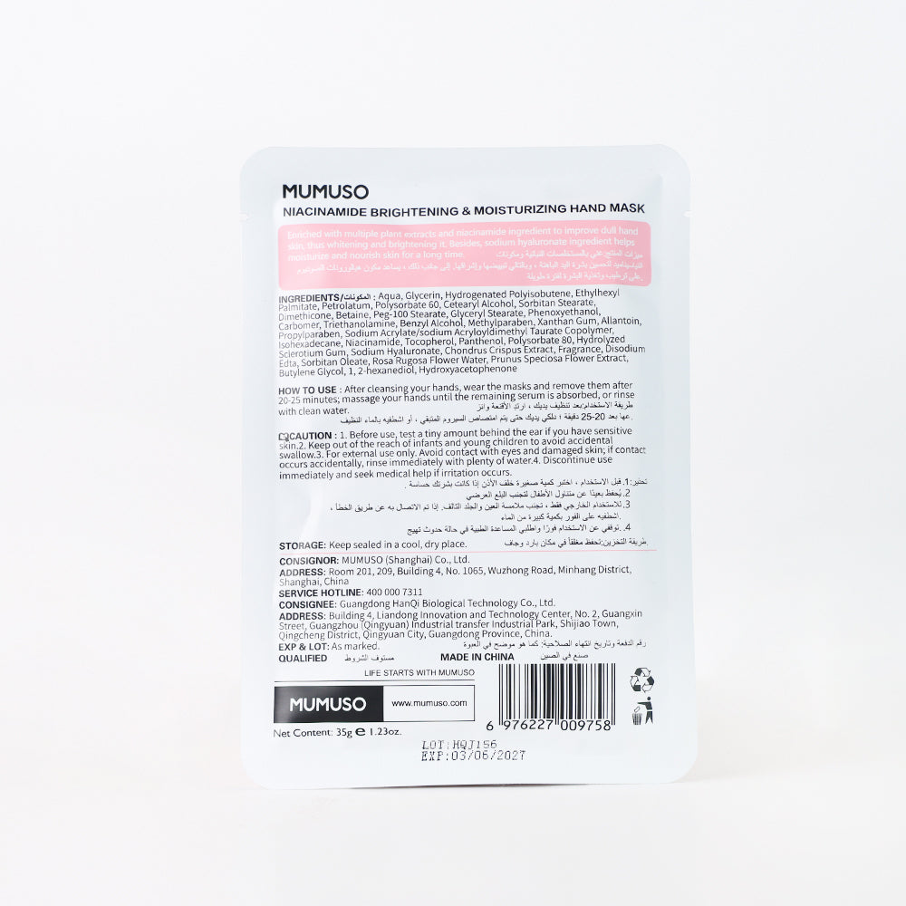 Indulge in the ultimate hand pampering experience with Mumuso's Niacinamide Brightening & Moisturizing Hand Mask. Infused with nourishing ingredients, this mask brightens and moisturizes your hands for a soft and radiant touch. Treat yourself to luxury and reveal beautifully rejuvenated hands.