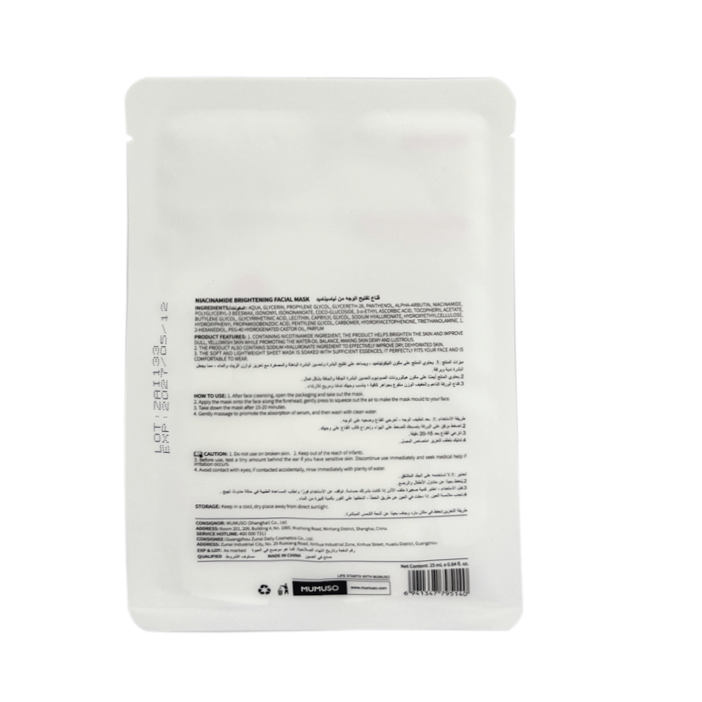 Mumuso Niacinamide Brightening Facial Mask is an innovative skincare solution that helps reduce dullness and discoloration. Its nourishing formula is enriched with Vitamin B3 for a brighter, more luminous complexion.