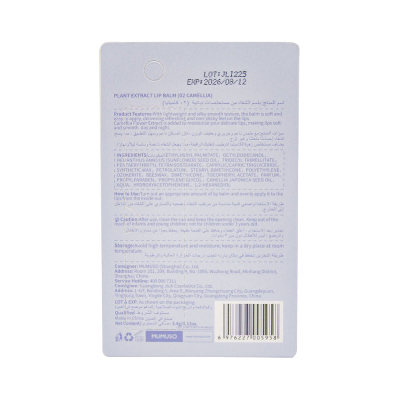 Mumuso Plant Extracts Lip Balm Camellia is enriched with camellia extracts that helps nourish and soften lips. The balm effectively hydrates lips and protects them from drying. Get silky-smooth lips with this plant-based balm.